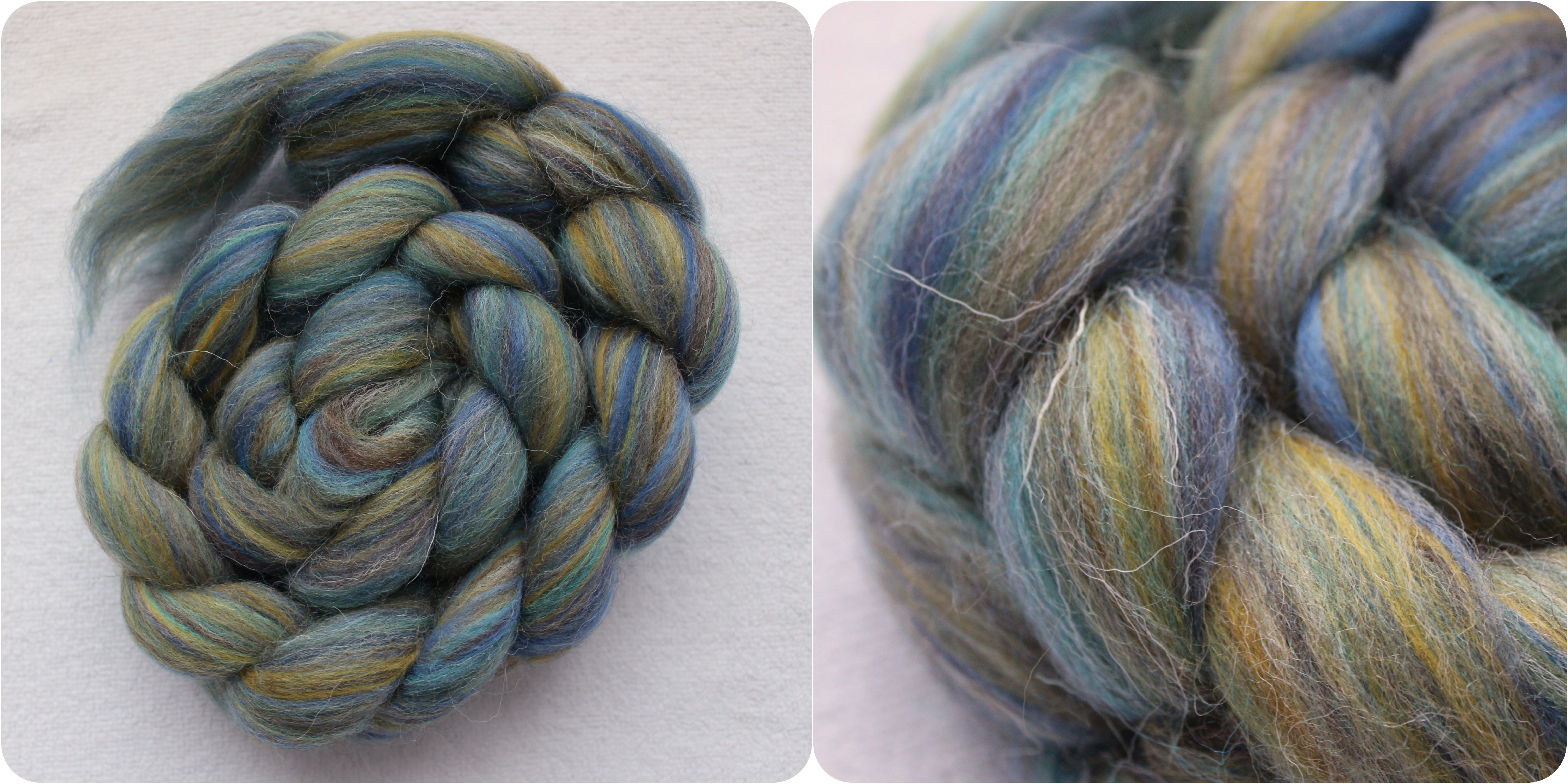 I have recently been reading and learning about a new-to-me technique called "Fibonacci Spun". This technique requires a braid of fibre that has long strips of different coloured fibre running the entire length of the braid, like this one does. It is also best if you spin one long single and chain (Navajo) ply it to keep the colours together.